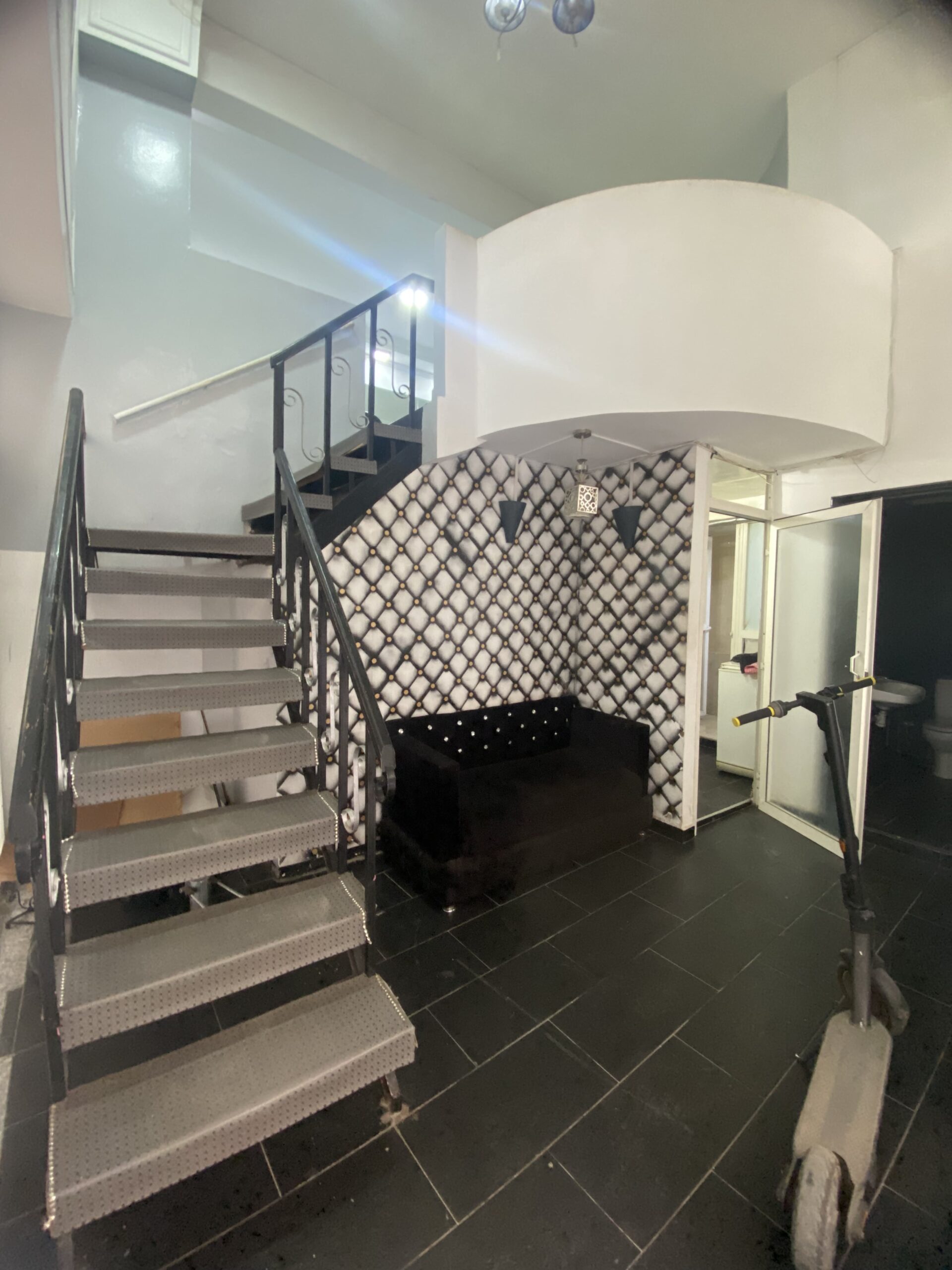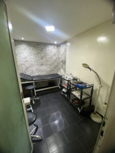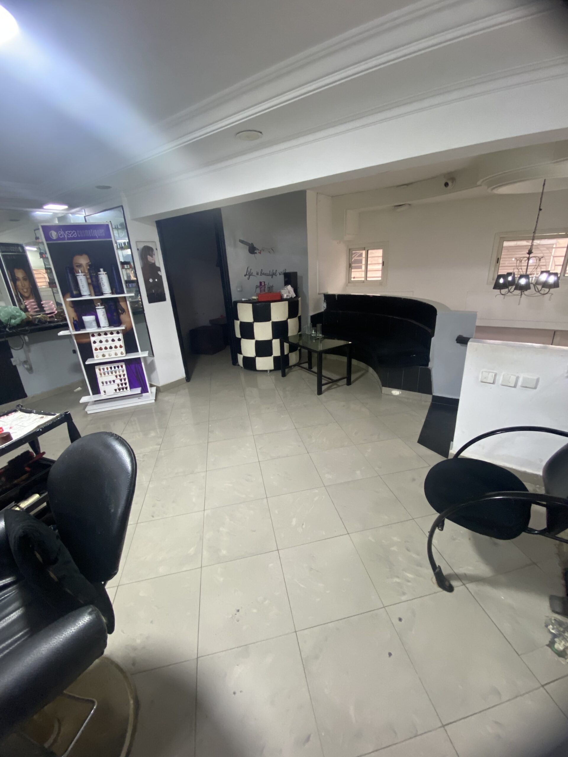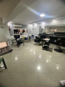 Le salon de coiffure, réparti sur deux niveaux, propose un équipement complet pour la coiffure à l'étage supérieur et un espace dédié à l'esthétique au rez-de-chaussée, incluant un petit hammam. Cet agencement permet une offre diversifiée de services de beauté dans un cadre confortable et professionnel.