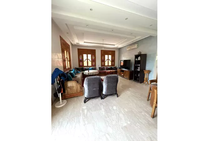 Au rez-de-chaussée (150 m²), elle offre un grand salon marocain, un salon européen avec coin cheminée, une cuisine, des toilettes invités et un espace réception avec double vasque.